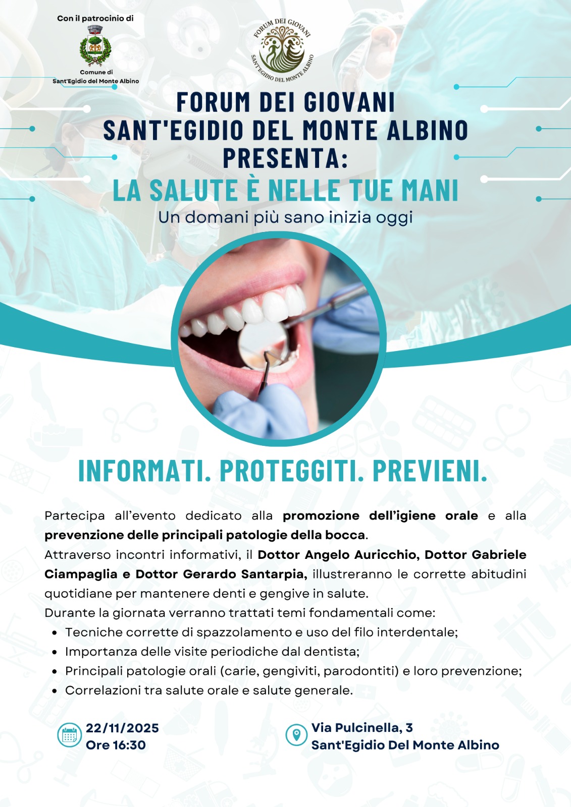 “La salute è nelle tue mani: Informati, Proteggi e Previeni”, Sabato 22/11/2025 alle ore 16:30 Sala Conferenze “Raffaele Pucci, Angelo Falcone e Giuseppe Carmine De Risi” (Via Pulcinella N.2).