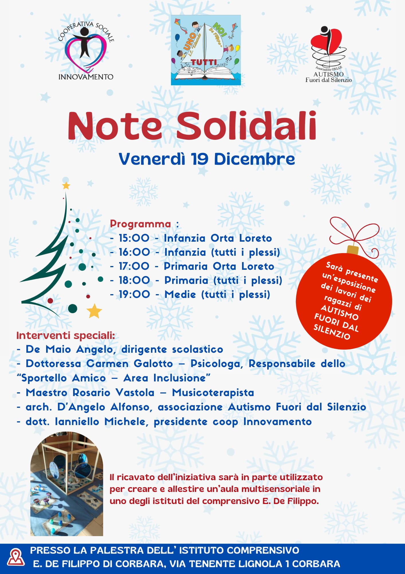 Si comunica a tutti i Genitori che Venerdì 19 Dicembre si terrà l’iniziativa “Note Solidali” presso la palestra dell’Istituto Comprensivo E. De Filippo (Corbara, Via Tenente Lignola).