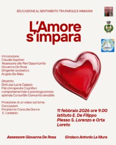 L’incontro si terrà mercoledì 11 febbraio 2026, a partire dalle ore 9.00 presso i plessi scolastici di Orta Loreto e San Lorenzo dell’ Istituto Comprensivo “E.De Filippo” e sarà articolato in un momento di riflessione guidata sul tema dell’educazione sentimentale, della consapevolezza emotiva e delle relazioni, con il supporto di un breve video particolarmente indicato per favorire la comprensione delle emozioni e il dialogo con i più giovani.