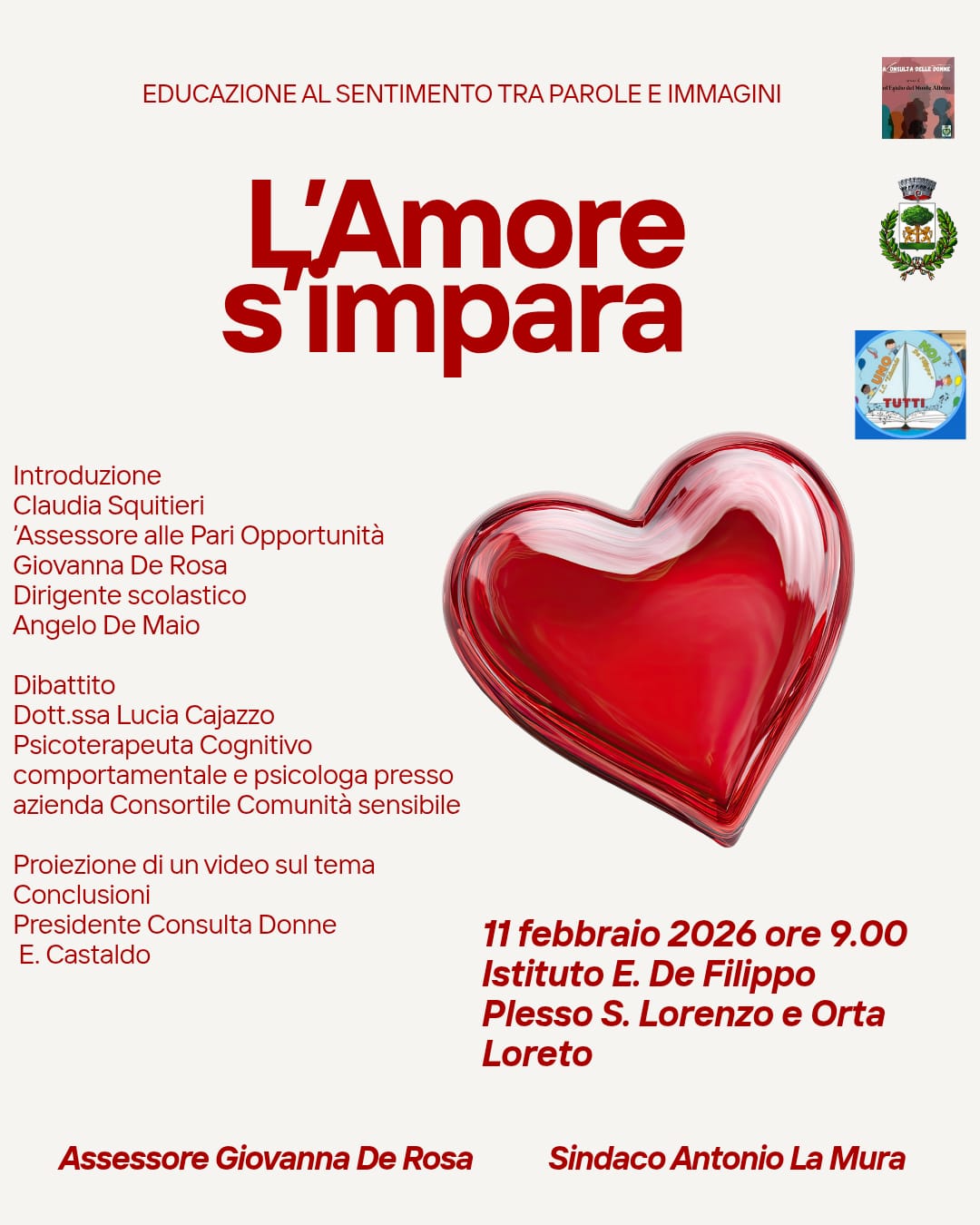 L’incontro si terrà mercoledì 11 febbraio 2026, a partire dalle ore 9.00 presso i plessi scolastici di Orta Loreto e San Lorenzo dell’ Istituto Comprensivo “E.De Filippo” e sarà articolato in un momento di riflessione guidata sul tema dell’educazione sentimentale, della consapevolezza emotiva e delle relazioni, con il supporto di un breve video particolarmente indicato per favorire la comprensione delle emozioni e il dialogo con i più giovani.