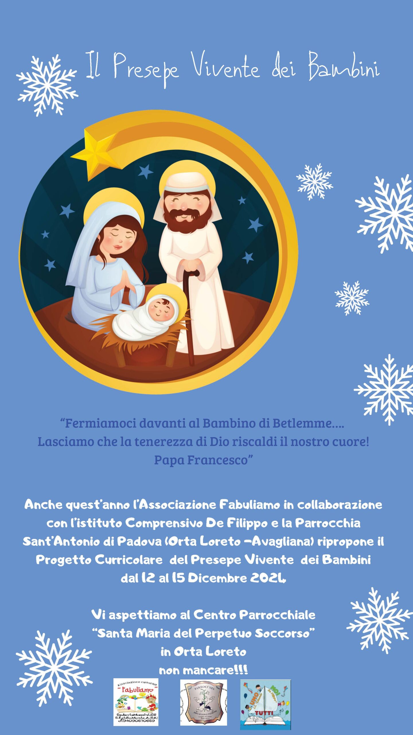 Il 12-13-14-15 Dicembre 2024 l’Associazione Culturale “Fabuliamo” in collaborazione con la Scuola Infanzia e Primaria dell’istituto “I.C. E.De Filippo” plesso Orta Loreto,con il patrocinio del Comune di S.E.M.A e della Diocesi della Parrocchia di Orta Loreto,avvierà il progetto “Presepe Vivente dei bambini”, allo scopo di stimolare lo sviluppo della creatività nel bambino attraverso l’uso dei linguaggi musicali,artistici ed espressivi , accompagnare il bambino nella scoperta del significato del far festa in un clima di amicizia, collaborazione, disponibilità e gioia condivisa, incentivare comportamenti di solidarietà .e riconoscere e valorizzare le diversità